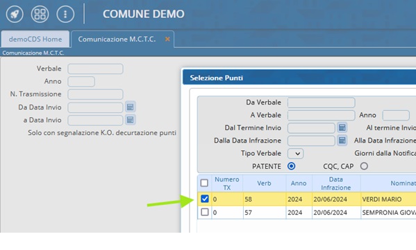 - Per effettuare l’invio dei punti per un solo verbale*: sarà necessario selezionarlo con l’apposito checkbox posto sulla prima colonna di sinistra.