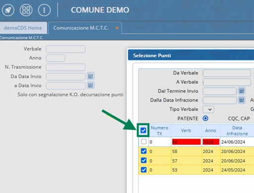 - Per effettuare l’invio dei punti per un solo verbale*: sarà necessario selezionarlo con l’apposito checkbox posto sulla prima colonna di sinistra.