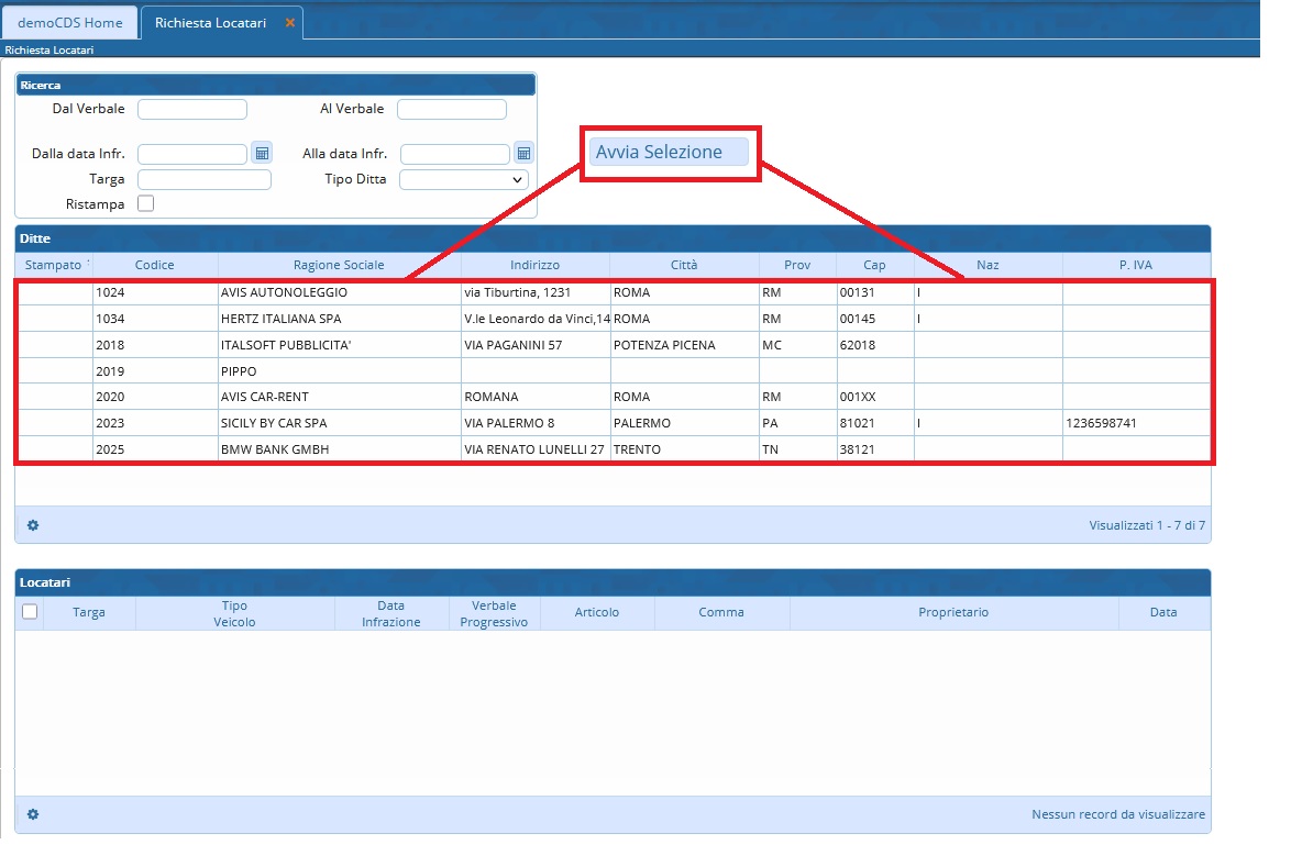 Una volta compilati i campi opzionali nel riquadro di ricerca, basterà fare click sul bottone [Avvia Selezione]. Nel riquadro sottostante, denominato 'Ditte', sarà presente la ditta di noleggio che possiede il veicolo.