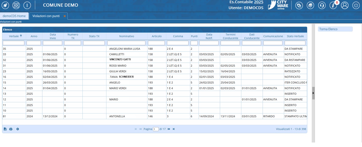 Questa scheda riepiloga in un elenco tutti i verbali inseriti all’interno del gestionale che hanno un articolo violato che prevedono punti. Per visualizzarla, dai tre puntini seguire il percorso: