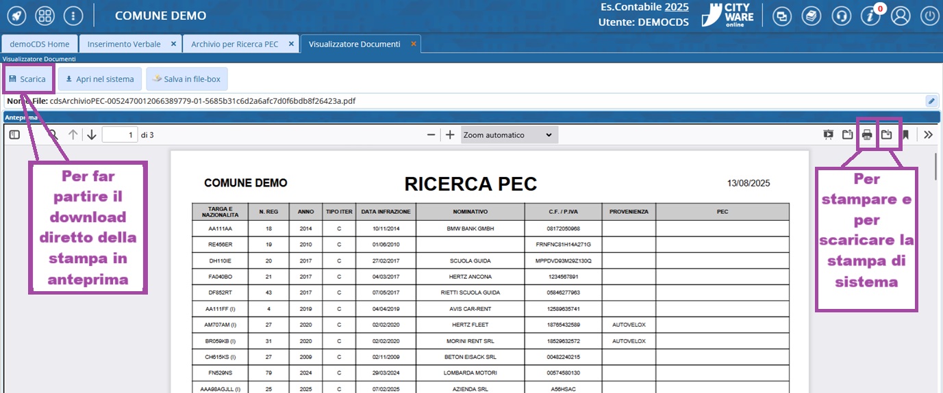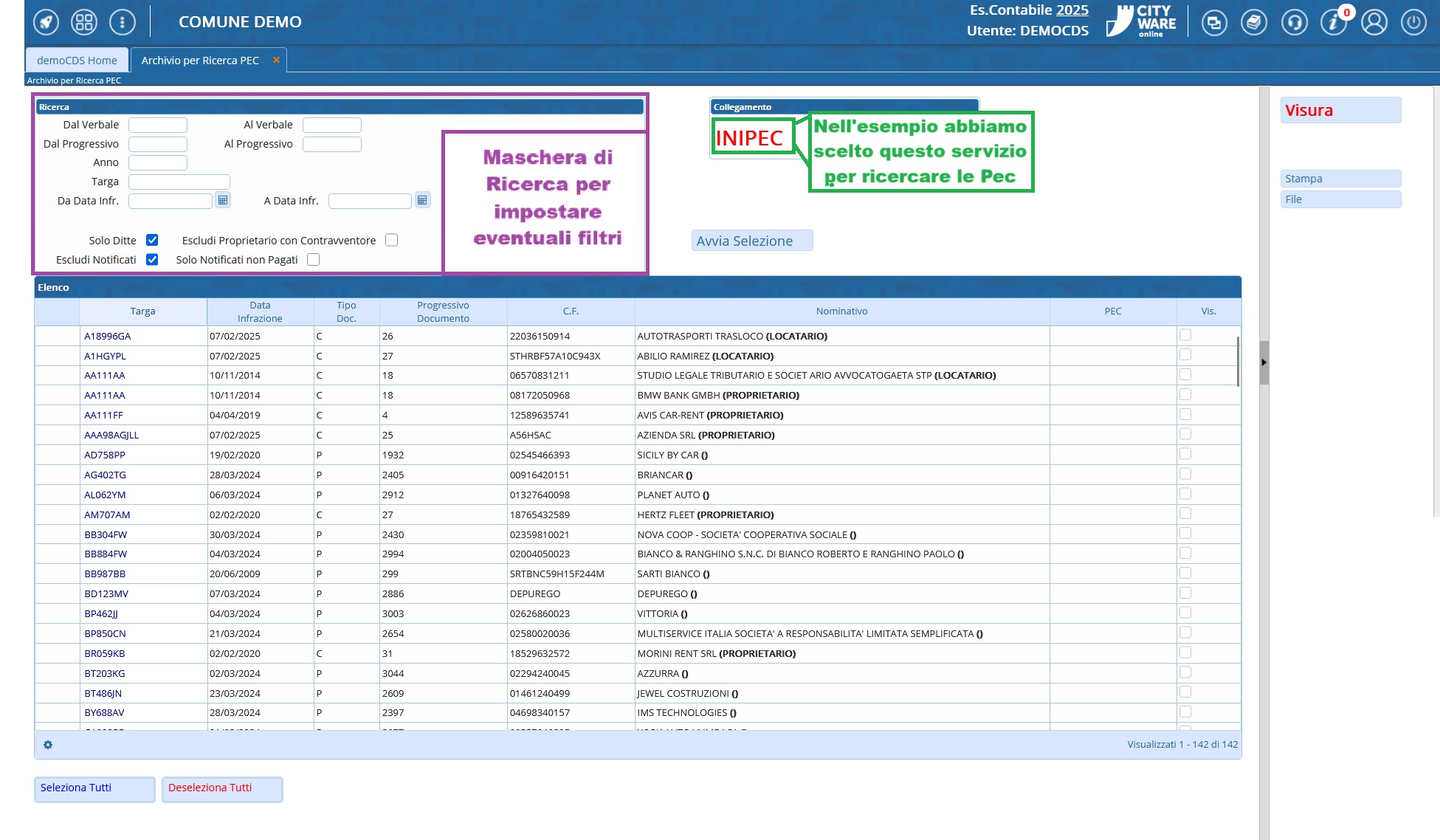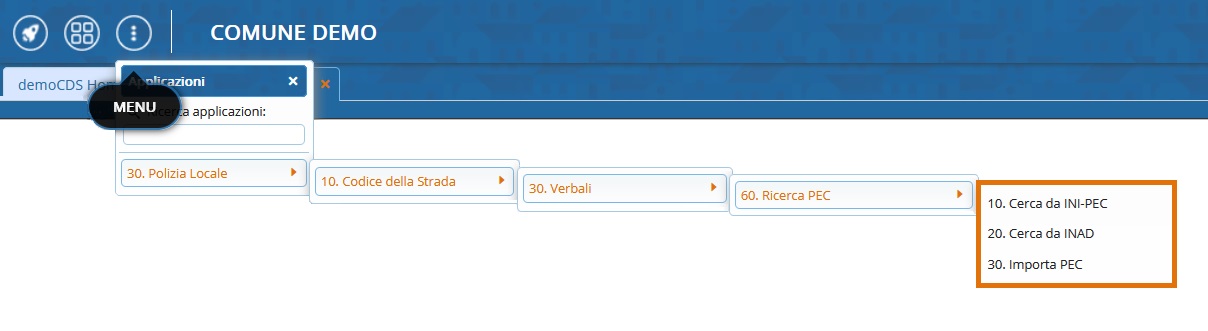 ▶ Codice della Strada ▶ Verbali ▶ Aggiorna/Inserisci Verbali ▶ Ricerca Pec