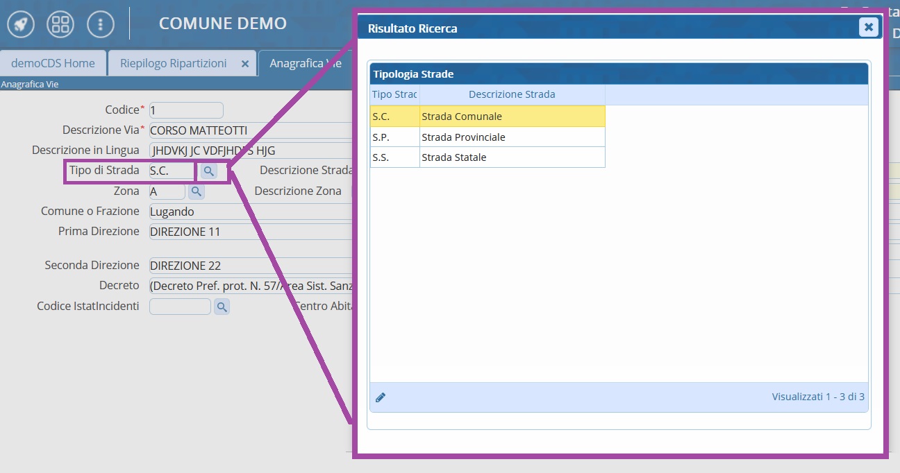 - per una Via: cliccando sulla freccetta in basso v si aprirà un menù a tendina dove potremmo scegliere una delle vie configurate nell'ente.