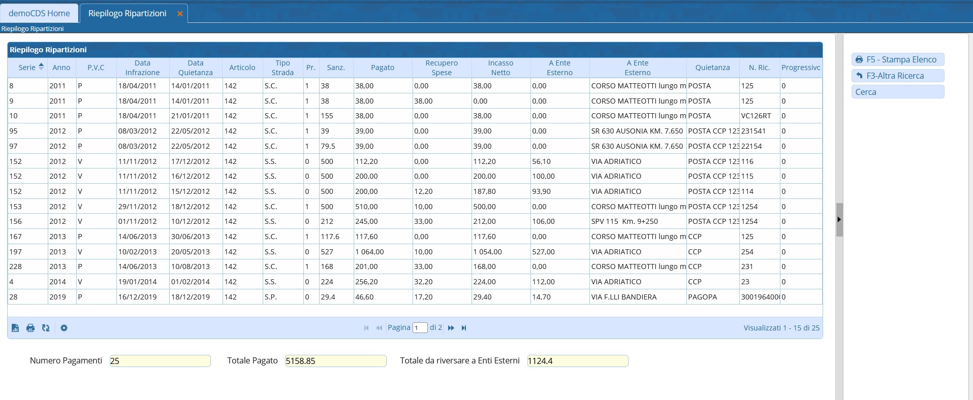 Il risultato verrà raccolto in una tabella ordinato per numero progressivo e per Data Richiesta (Intesa come Data di Richiesta della Rateizzazione). Sotto la tabella con i risultati, vedremo dei contatori denominati “Numero Pagamenti”, “Totale Pagato” e il “Totale da riversare a Enti Esterni”.