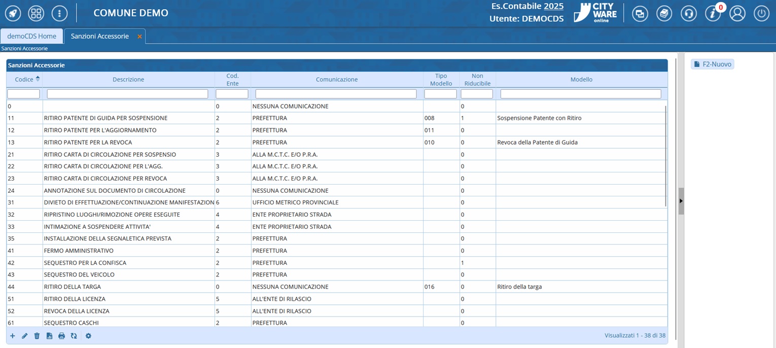 Andando in questa sezione del programma, a seconda delle nostre esigenze, sarà possibile consultare l'elenco delle Sanzioni Accessorie inserite nell'anagrafica del comune, ma è possibile anche aggiungere nuove Sanzioni e modificarle o cancellarle.
