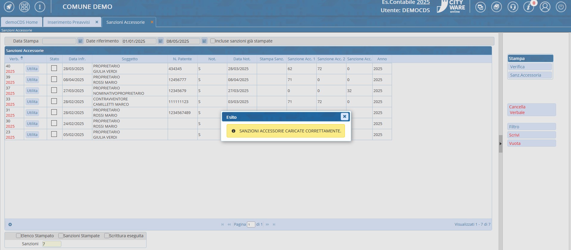 La schermata inizale si presenta con l’elenco delle sanzioni accessorie in attesa di essere stampate.
