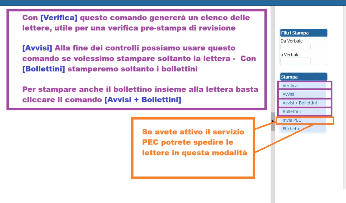 - fare la stampa obbligatoria di Verifica cliccando sul comando [Verifica] (a destra dello schermo) prima di poter fare la stampa singola o massiva degli Ultimi Avvisi con o senza bollettini