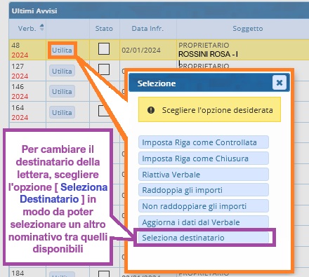 Per cambiare il destinatario della lettera Ultimo Avviso bisogna cliccare sul comando [Utilita] (presente a capo della riga del rispettivo verbale). Questo comando offre diverse funzioni, ma in questo caso sceglieremo l'opzione: Seleziona Destinatario come scegliere il Destinatario della lettera.