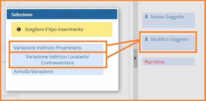 bisogna effettuare l'operazione di variazione dati (sia per tipo soggetto proprietario, locatario o per contravventore), cliccare su [Modifica Soggetto], presente sempre sulla destra dello schermo.