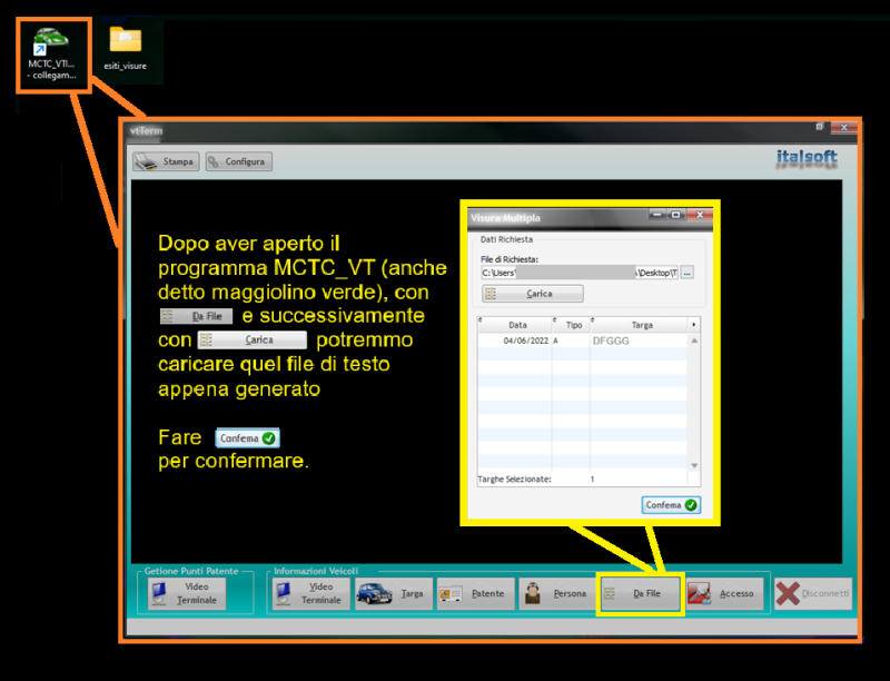Dopo aver collegato la VPN, aprire il video terminale della motorizzazione “MCTC_VTinfo” e fare click sul bottone con l'icona della pagina “Da File”, carica quel file txt e confermare con [conferma]