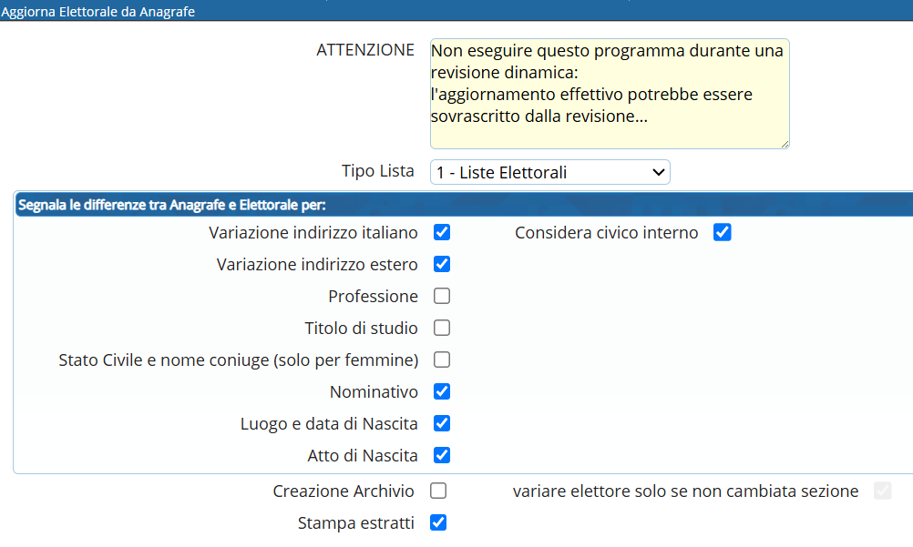 Il programma di aggiornamento massivo dei dati elettorali da anagrafe serve per aggiornare principalmente i dati legati ad una variazione indirizzo italiano o estero che non comporti un cambio di sezione (campi proposti di default). E' possibile allineare anche i dati di professione, titolo di studio, stato civile e nome coniuge(solo per femmine), nominativo, luogo e data di nascita, atto di nascita.