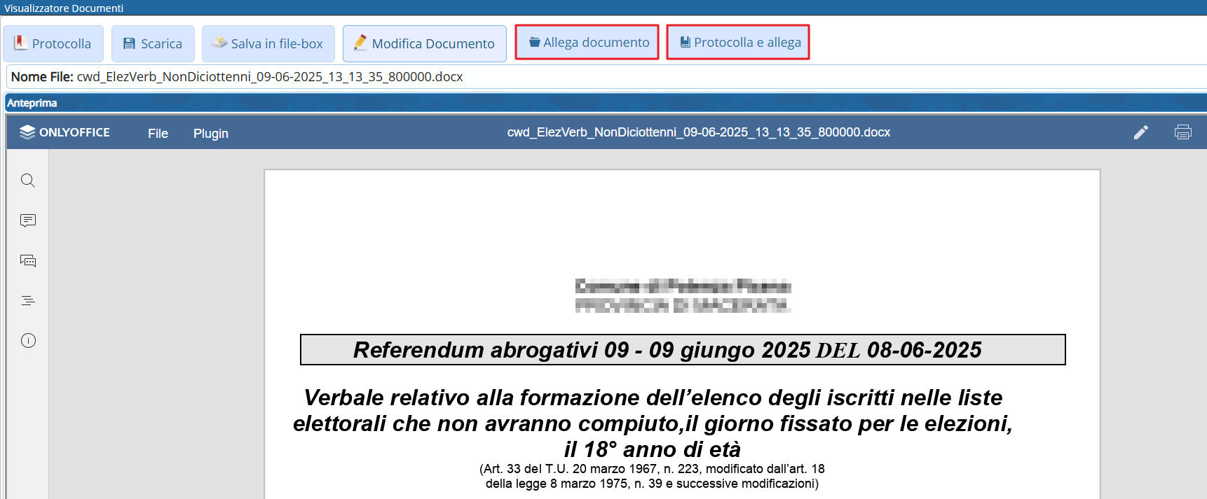 In tutti i programmi elettorali, comprese le revisioni, la stampa dei Verbali e degli allegati può essere allegata al verbale che assegnate attraverso i pulsanti allega e protocolla e allega permettendo quindi la conservazione di tutti i documenti che generate.
