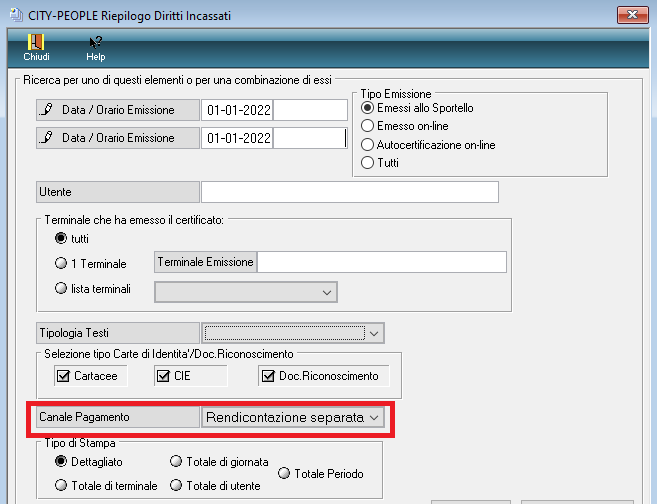 Per poter verificare le CIE pagate tramite pagoPA è possibile fare il Riepilogo Diritti Incassati (da Menu Sportello) scegliendo come canale di pagamento Rendicontazione Separata.