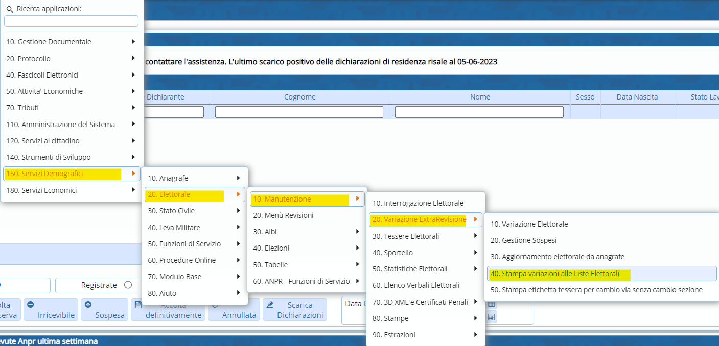 Servizi demografici ⇒ Elettorale ⇒ Manutenzione ⇒ Variazione extrarevisione ⇒ Stampa variazioni alle liste elettorali