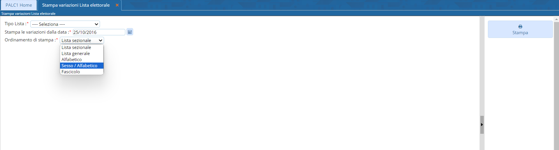 E’ possibile scegliere il “Tipo di lista” che si vuol stampare e il modo di “Ordinamento di stampa”