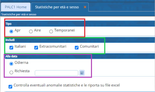 E' possibile effettuare una statistica della popolazione Residente (APR) oppure Aire (Anagrafe Italiani Residenti all'Estero) o Temporanei (Temporaneamente iscritti in anagrafe per massimo un anno per la richiesta del medico)