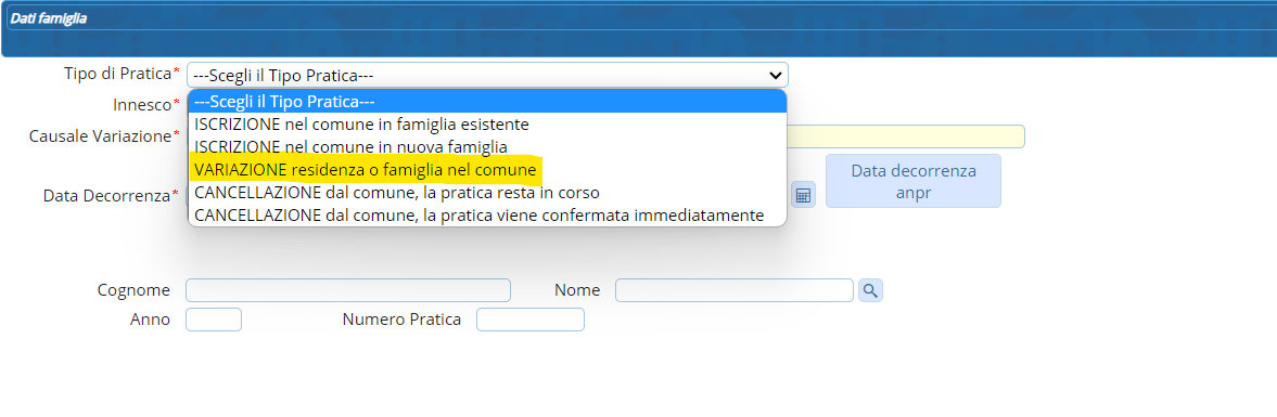 Per fare una Pratica di Variazione di Residenza o di Famiglia nel Comune il programma aprirà l’interfaccia delle Pratiche, e nel menù a tendina sotto la voce tipo pratica selezionare la Variazione.