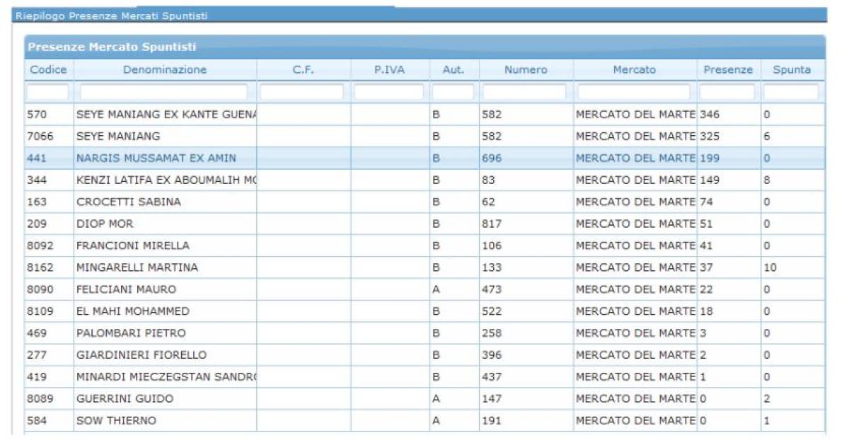 La voce del menù Presenze Mercati Spuntisti permette di avere una panoramica della graduatoria del mercato spuntisti.