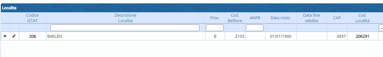 Da qui è possibile effettuare una ricerca delle località sia Italiane che Estere. Quelle italiane sono raggruppate per provincia, e quindi in ordine alfabetico di comune. La tabella delle località straniere è invece raggruppata per stato di appartenenza secondo la codifica fornita dall'ISTAT per gli stati stranieri. Entrambe le tabelle sono presenti anche sul data base fornito a corredo dell'applicativo. In caso di importazione sul data base utilizzato da Cityware Online, l'Ente deve inserire le singole località straniere. (Le località italiane vanno inserite con il codice fornito dall' ISTAT mentre per le località straniere prima è obbligatorio inserire la Nazione poi le singole località all'interno dello stato stesso.) Per inserire una nuova località basta cliccare sul bottone → Nuovo.