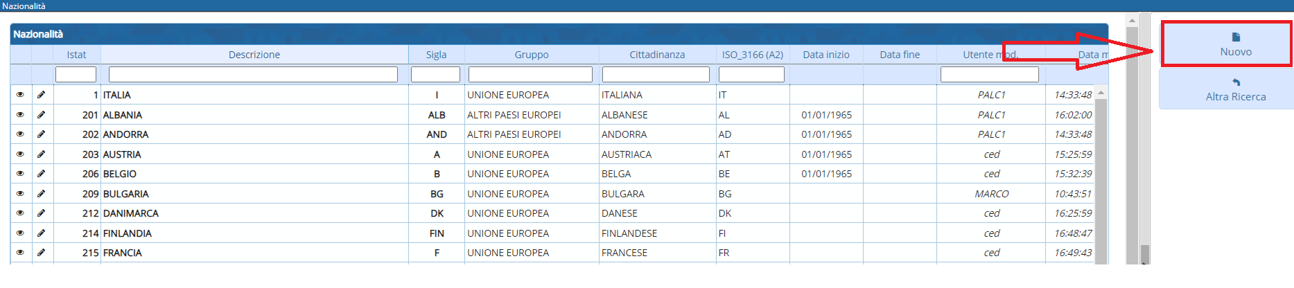 Punto di menù: Servizi Demografici → Modulo Base → Tabelle Generali → Stati e Paesi → Nazioni