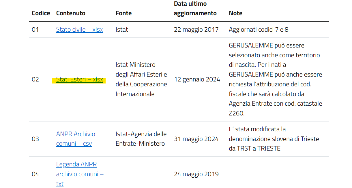 Aprire il file excel scaricabile dalle tabelle di decodifica di ANPR, per poter inserire i codice riferiti a quella specifica nazione.