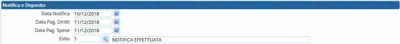 Nella tabellina Notifica e Deposito possono essere inseriti la data di notifica, le date di pagamento dei diritti e delle spese e l'esito della notifica, scegliendolo direttamente dall'Anagrafica degli Esiti, accessibile dalla lentina