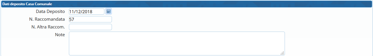 Nella tabellina Dati deposito Casa Comunale possono essere inseriti la data di deposito e il numero delle raccomandate, oltre a eventuali note.