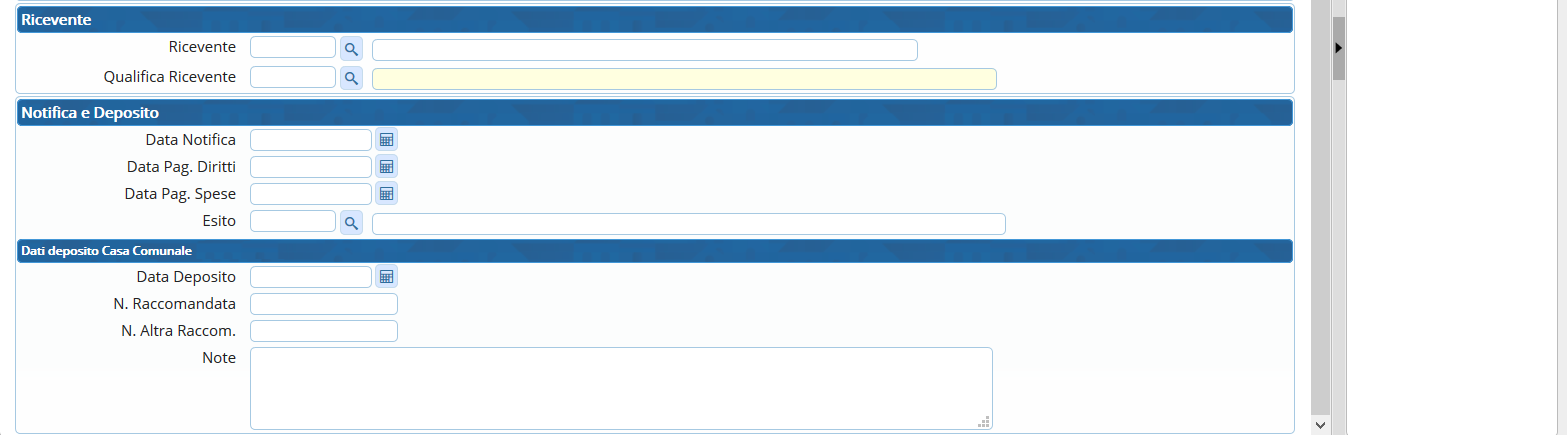 Spostarsi nella parte bassa della schermata per compilare i campi relativi a Ricevente, Notifica e/o Deposito.