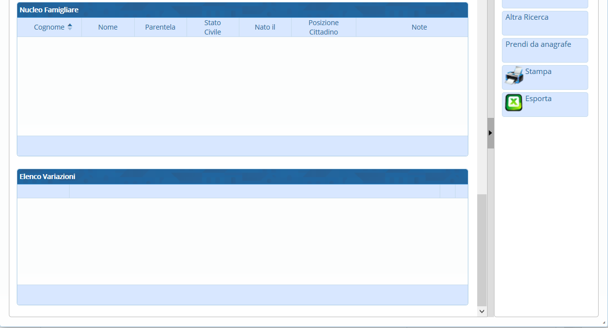 Inserendo alcuni dati anagrafici nei campi di ricerca e cliccando Elenca, verranno elencati nella tabella tutti i nominativi presenti. Selezionandone uno con un doppio click, saranno mostrate tutte le informazioni specifiche che lo riguardano.