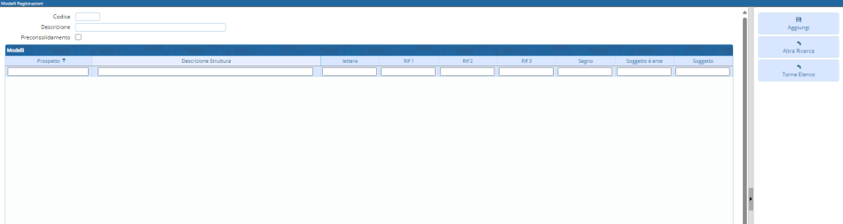 Per creare una nuova tipologia, basta inserire nell'apposito campi di testi il codice, una breve descrizione e una checkbox per indicare se il record sia o meno preconsolidato. La pagina conterrà la griglia con i valori precedentemente inseriti, le funzioni disponibili saranno le medesime della tabella descritta sopra, però da questa pagina non sarà possibile ne cancellare ne modificare dei record.