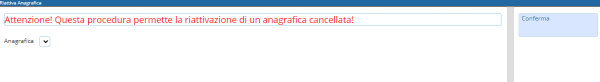 La pagina contiene una tab che se aperta permetterà di scegliere quale anagrafica riattivare e un bottone di conferma per confermare la scelta fatta.