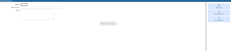 Per creare una nuovo riferimento di revisione, basta inserire nell'appositi campi di testo il codice, una breve descrizione ed eventuali note. I bottoni presenti alla destra permettono di: