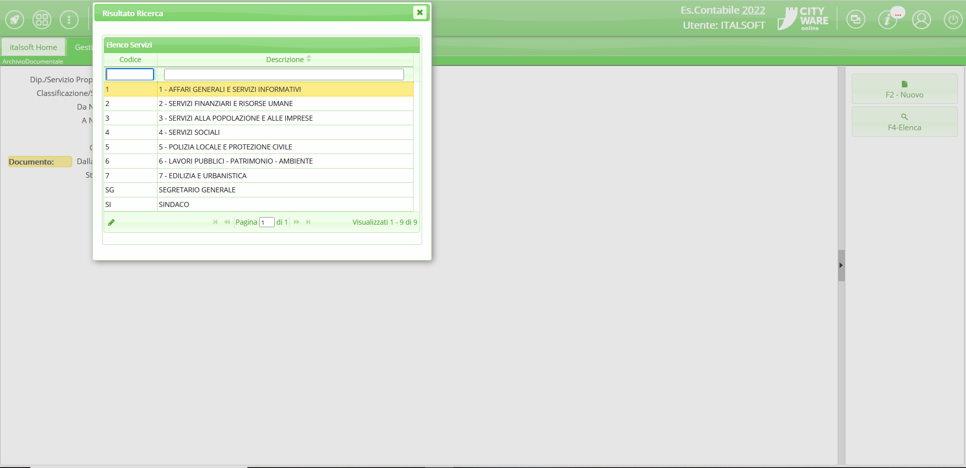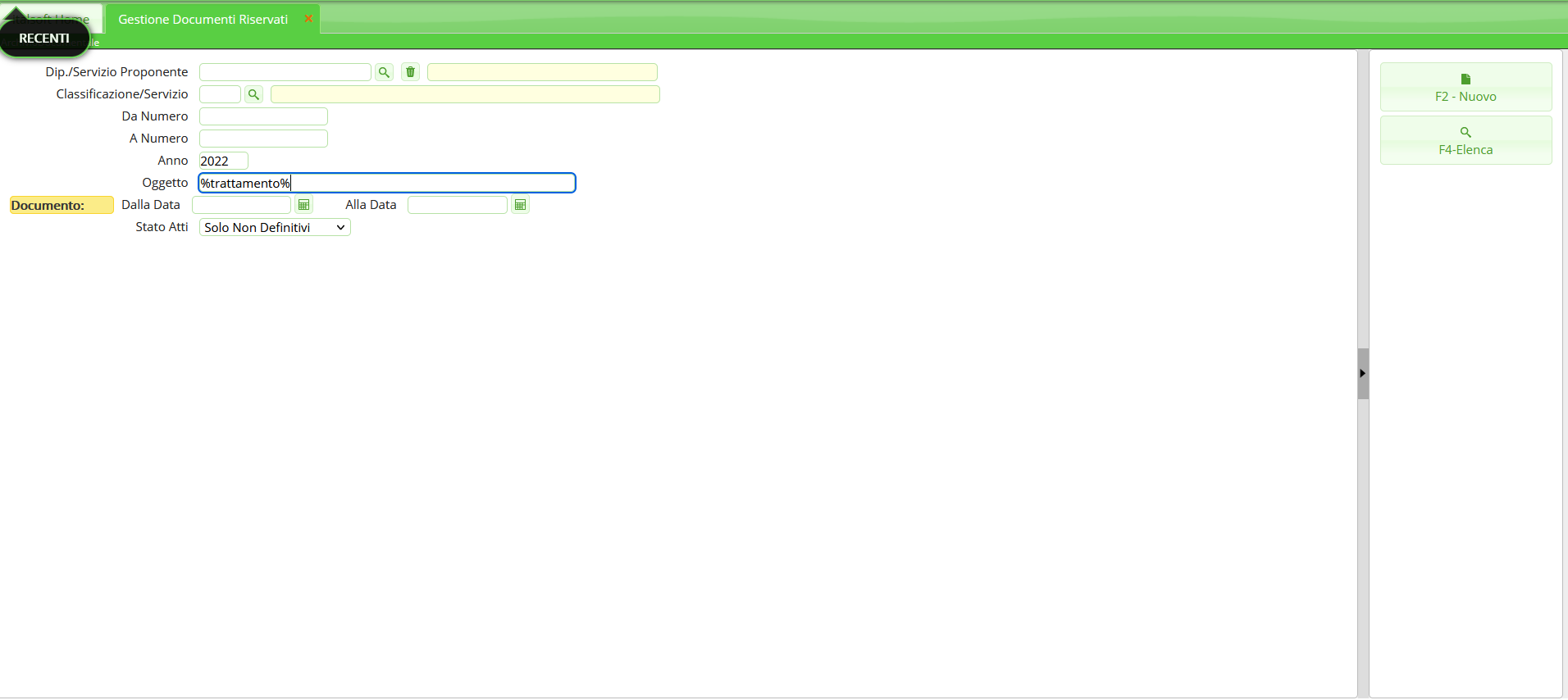 Dalla schermata principale è possibile creare un nuovo record tramite il pulsante “Nuovo”; dalla stessa schermata è possibile impostare un filtro di ricerca.