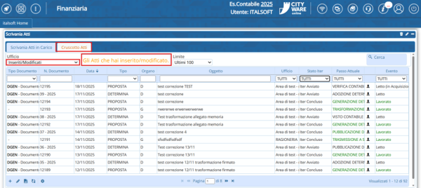 Accedendo alla scheda “Cruscotto Atti”, si ha quindi la possibilità di accedere alla lista degli atti di interesse per proseguirne la lavorazione o semplicemente consultarli. La scheda mostra in elenco anche gli atti per i quali non è stato ancora avviato l’iter di lavorazione, evitando di fatto di dover ricorrere alla ricerca degli atti tramite apposita funzione. E’ sufficiente accedere al dettaglio dell’atto di interesse con doppio clic.