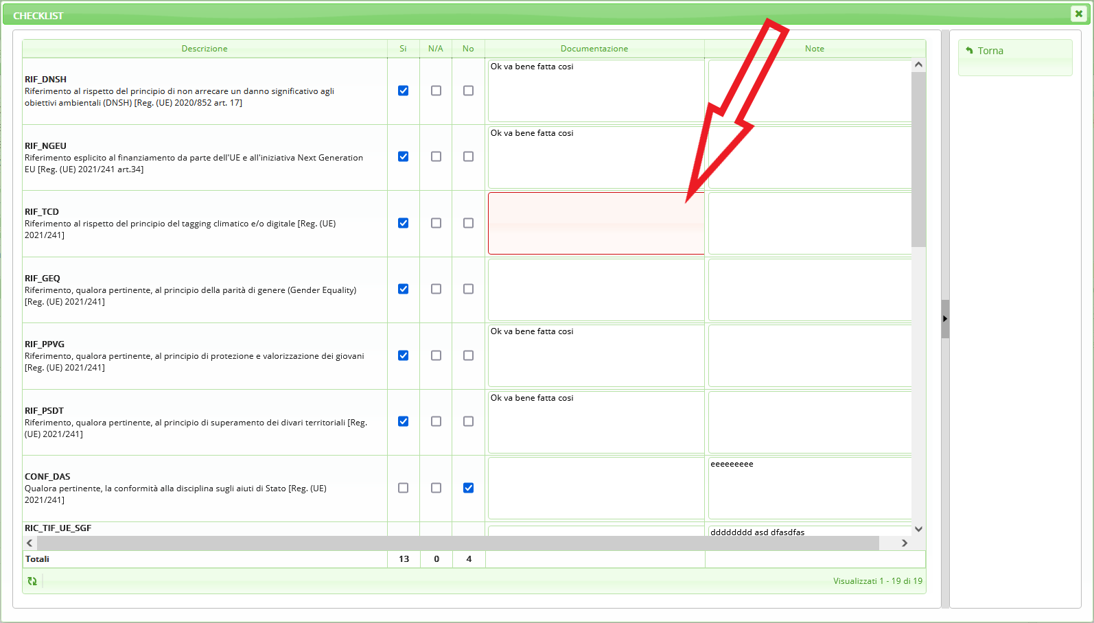 Nell'immagine sottostante viene mostrata la prima voce della checklist (evidenziata in verde) correttamente valorizzata: l'operatore ha selezionato il campo “N/A” ed ha valorizzato il corrispondente campo “Note”. Tutte le altre voci invece erano già state correttamente impostate selezionando il campo “Sì” e valorizzando il corrispondente campo “Documentazione”. Si noti come sulla schermata in questione non sia presente il tasto “Aggiorna”: i dati inseriti vengono infatti salvati in modo dinamico e dunque - per tornare alla gestione del passo, salvando i dati inseriti - è sufficiente cliccare sul tasto “Torna”