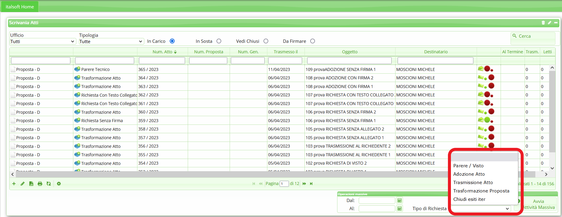 Una volta che sarà stata attivata la gestione massiva dei passi di iter, nel portlet “Scrivania atti” - tramite il menu a tendina, in corrispondenza del pannello “Operazioni massive” - si potrà selezionare il “Tipo di Richiesta”, in modo da filtrare i documenti attualmente in carico in base al passo di iter da gestire