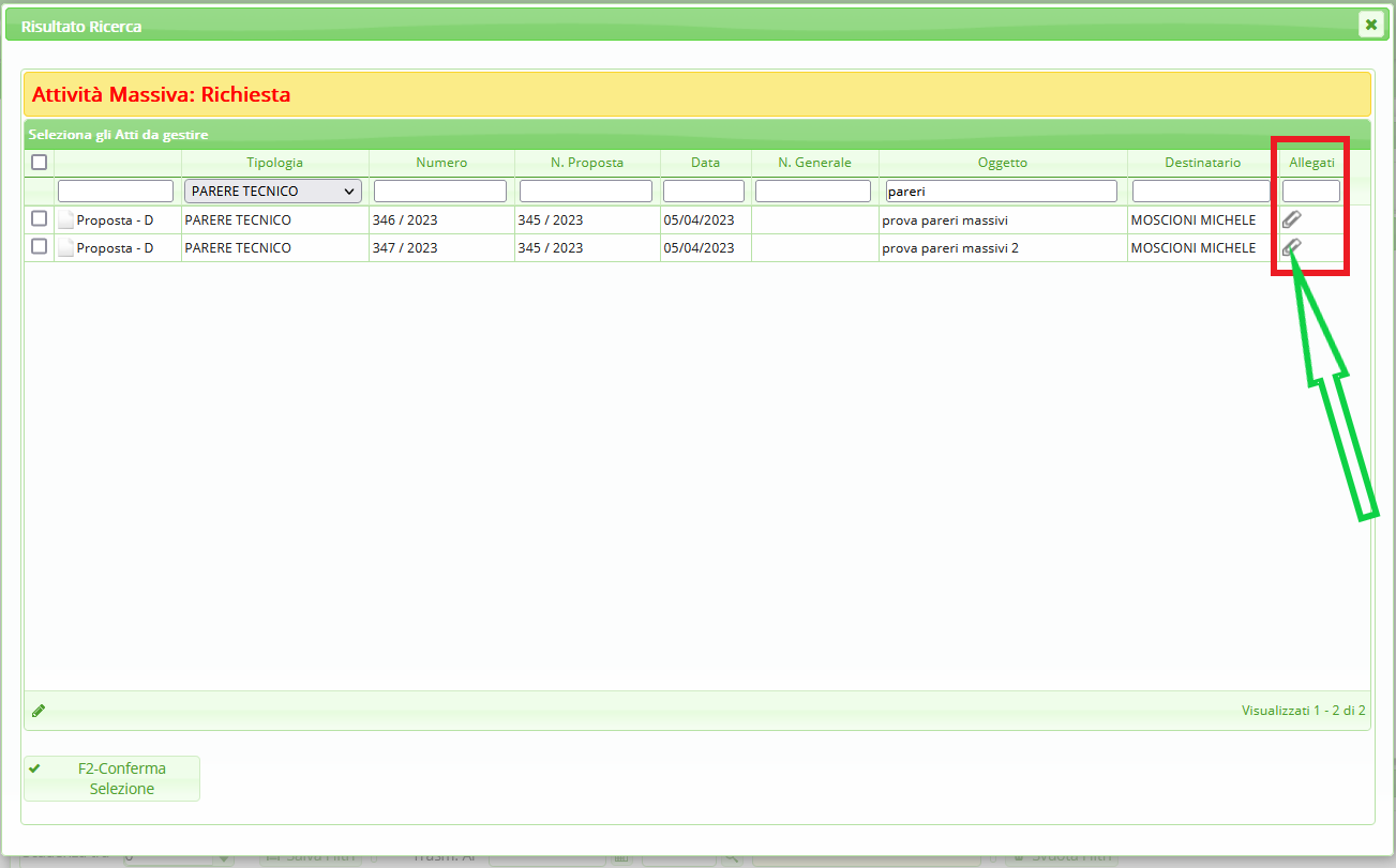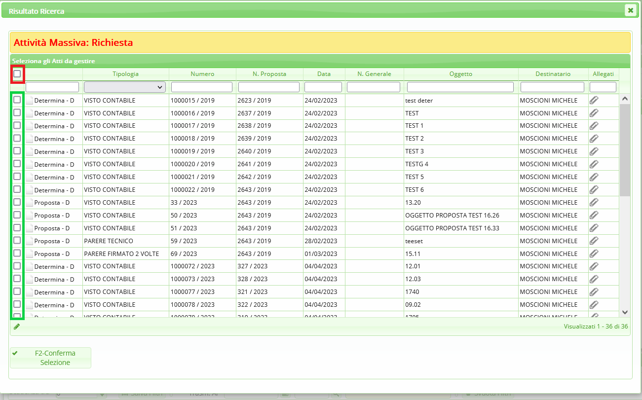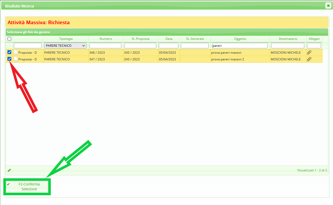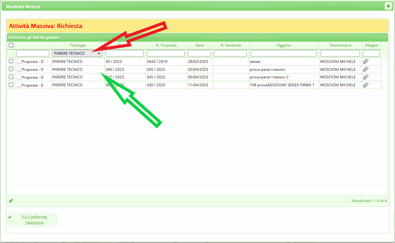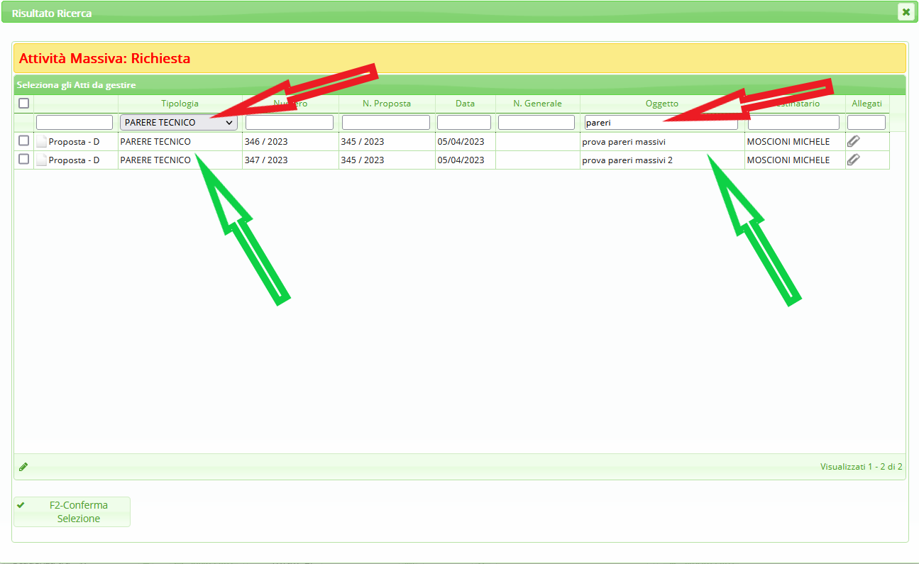 A questo punto, l'operatore - soddisfatto della selezione operata - andrà a spuntare tutte le caselle della prima colonna (indicate dalla freccia rossa nell'immagine seguente), per poi cliccare sul pulsante “Conferma Selezione” (indicato dalla freccia verde nell'immagine seguente)