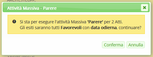 Lo stesso avviso viene mostrato qualora per il selezionato tipo di richiesta da gestire massivamente, non siano presenti attività di questo tipo in carico all'operatore con data di trasmissione compresa nell'intervallo di date impostato