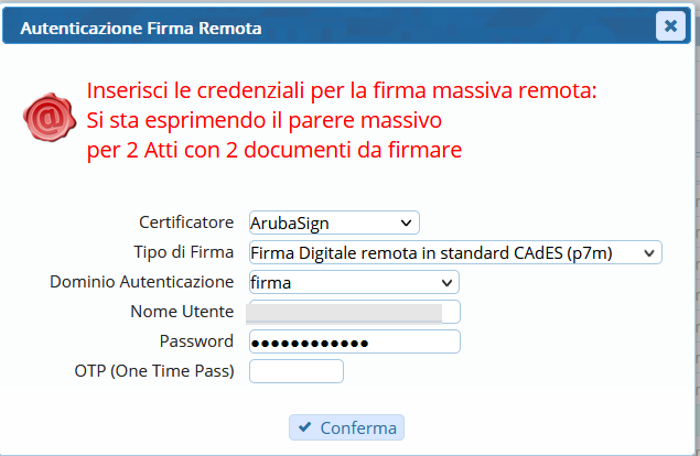 Qualora - anche solo per alcune delle operazioni impostate - sia prevista l'apposizione di una firma digitale, il sistema provvederà ad avviare la relativa procedura, come mostrato nell'immagine sottostante. In questo pannello il sistema indicherà inoltre il numero di documenti per i quali si sta apponendo la firma digitale