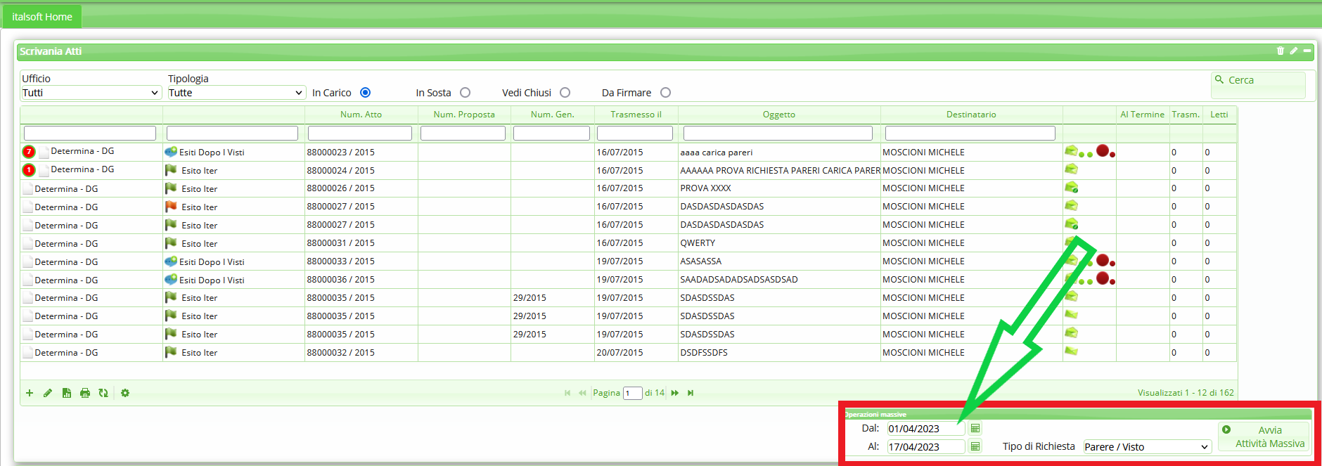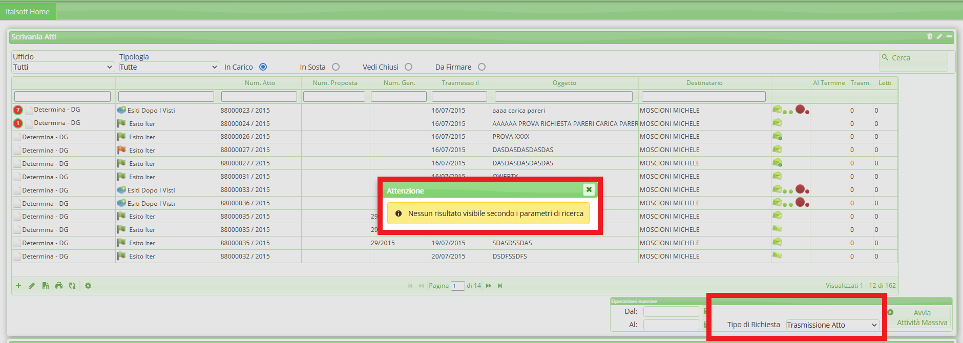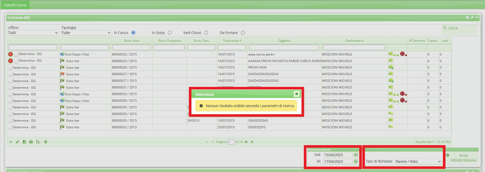 Di seguito viene brevemente indicato come sia possibile filtrare il pannello delle attività massive in funzione della data di trasmissone dei passi di iter e vengono mostrati gli avvisi proposti dal sistema qualora i settaggi impostati per la gestione delle attività massive siano carenti o non producano risultati