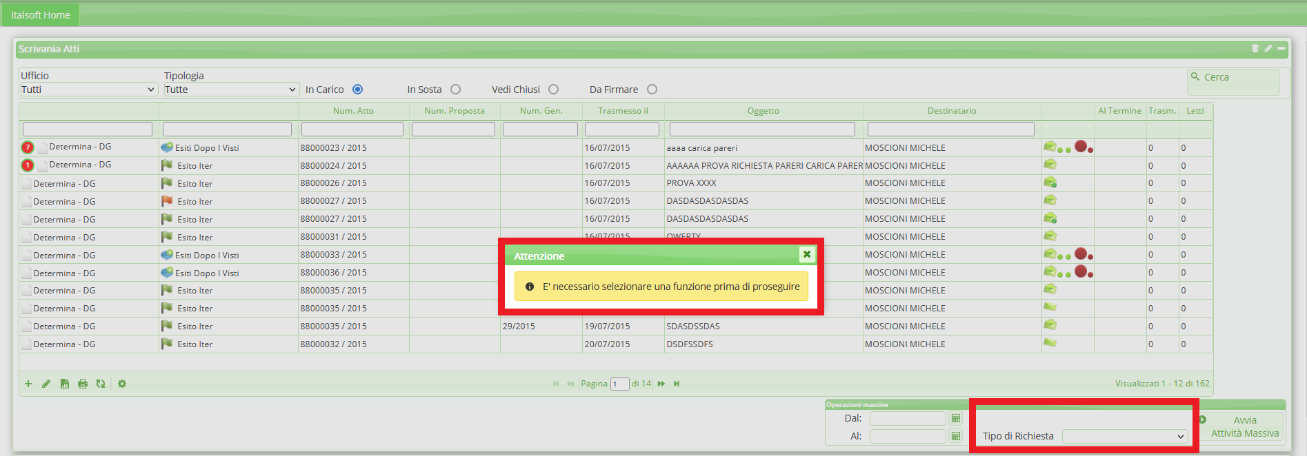 L'avviso mostrato di seguito indica che, prima di cliccare su “Avvia Attività Massiva”, non è stato selezionato alcun tipo di richiesta da gestire massivamente