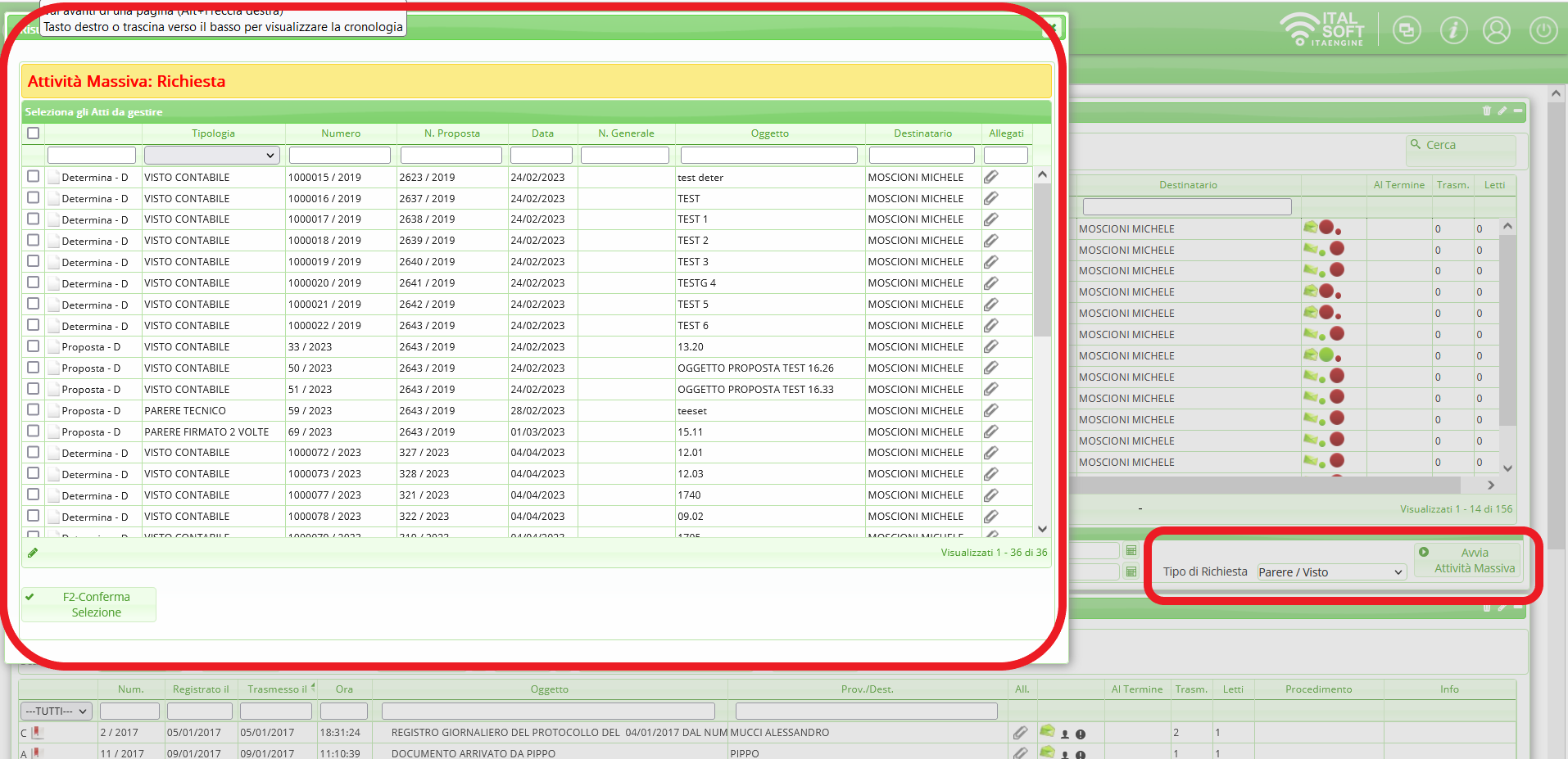 Nell'immagine seguente viene infatti evidenziato il pannello proposto dal programma nel momento in cui si è impostato il menu a tendina del campo “Tipo Richiesta” su “Visti/Pareri” (ad esempio) e si è cliccato successivamente su “Avvia Attività Massiva”: il programma riporta in questo pannello tutti i passi di iter - attualmente in carico all'operatore - che prevedano una attività di apposizione del visto/parere