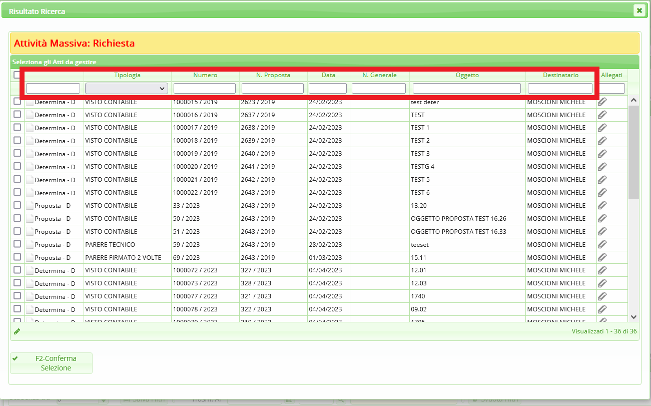 A questo punto, l'operatore che ha filtrato i risultati proposti per le attività massive - prima di procedere - potrebbe avere necessità di fare un'ultima verifica riguardante i testi degli atti che sta gestendo: infatti l'ultima colonna del pannello riporta, riga per riga, un'icona a forma di graffetta che consentirà - cliccandoci sopra - di visualizzare i testi attualmente associati all'atto corrispondente