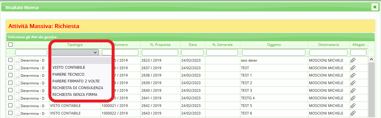 L'unica intestazione di colonna a fare eccezione è quella relativa alla tipologia del passo di iter che si vuole gestire massivamente: infatti nell'immagine seguente viene evidenziato il menu a tendina in corrispondenza dell'intestazione della colonna “Tipologia”, che riporta tutte le tipologie presenti attualmente nel pannello di gestione massiva