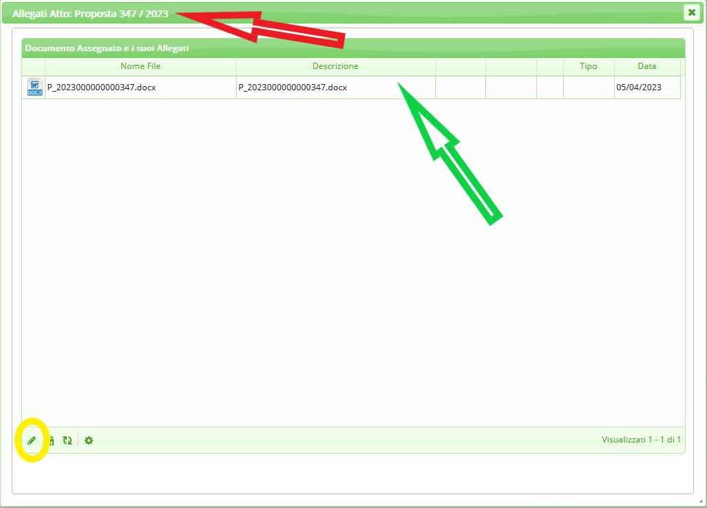 Il programma proporrà dunque un altro pannello la cui intestazione (indicata con freccia rossa nell'immagine seguente) riporta il riferimento all'atto in questione ed al cui interno si potranno consultare i testi attualmente associati all'atto: operando un doppio click su un punto qualsiasi della riga (indicata con freccia verde nell'immagine seguente), si provvederà a scaricare sul proprio dispositivo il testo selezionato; diversamente, si potrà visualizzare un'anteprima dello stesso testo - tramite il visualizzatore del proprio browser (Chrome, Firefox, Opera…) - operando un click singolo su un punto qualsiasi della riga e cliccando successivamente sull'icona a forma di matita (nell'immagine seguente, riportata in basso a sinistra ed evidenziata in giallo)