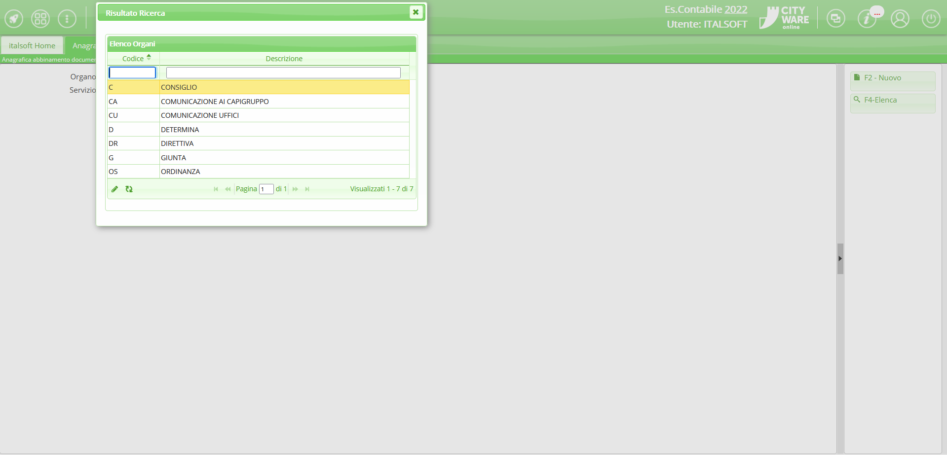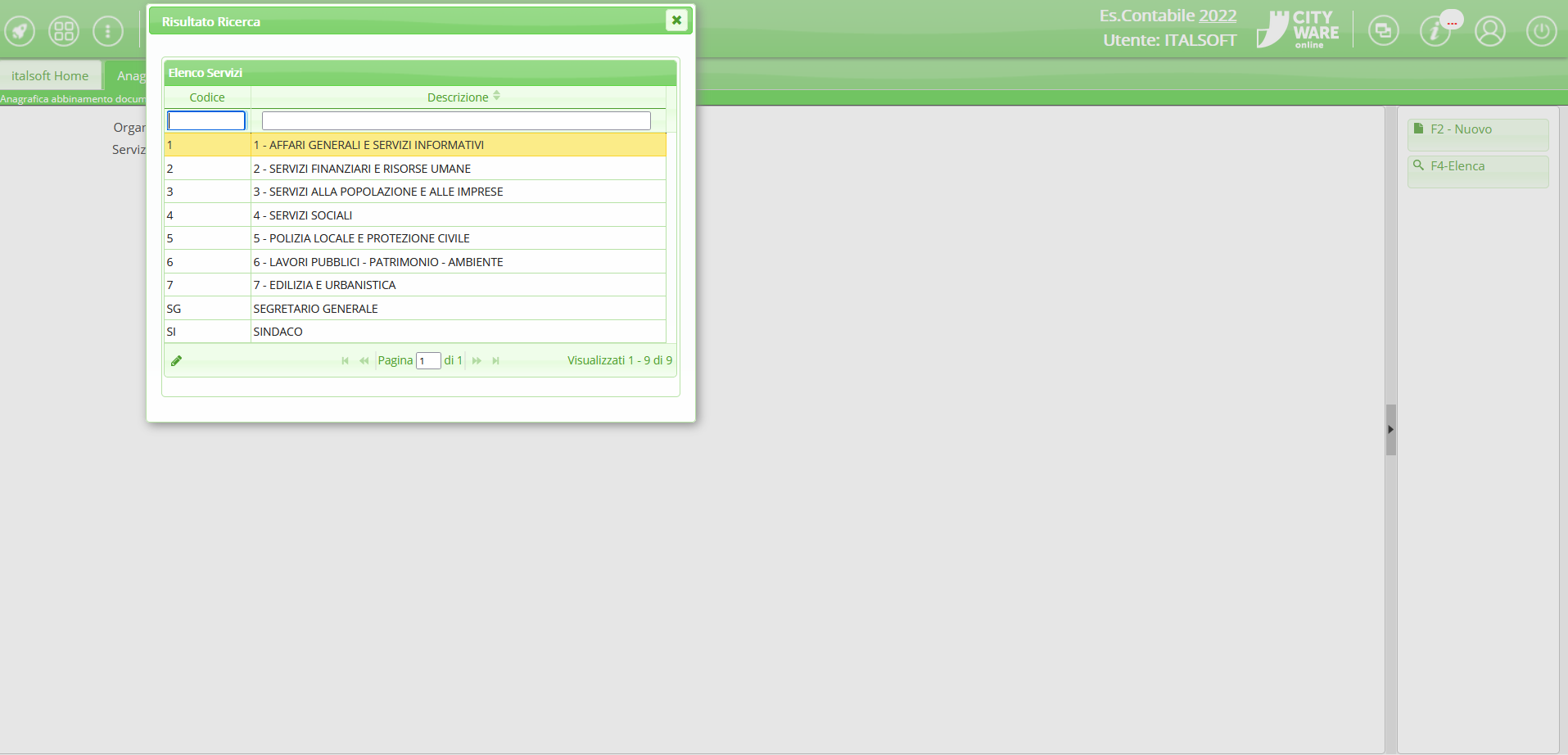 Si accede ad Organi/Servizi to CityWare attraverso il menù → Gestione Documentale → Archivi → Organi/Servizi to CityWare.