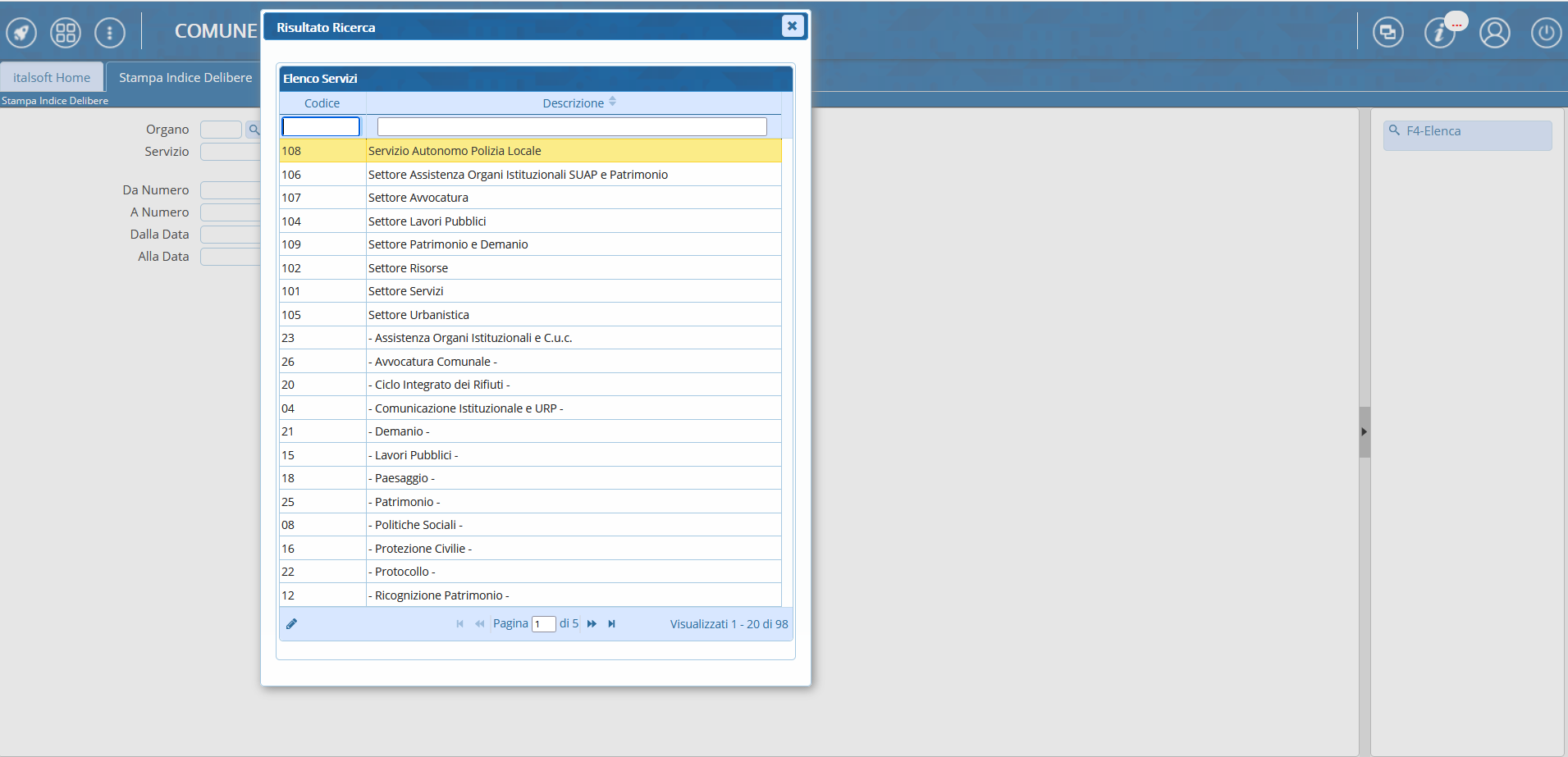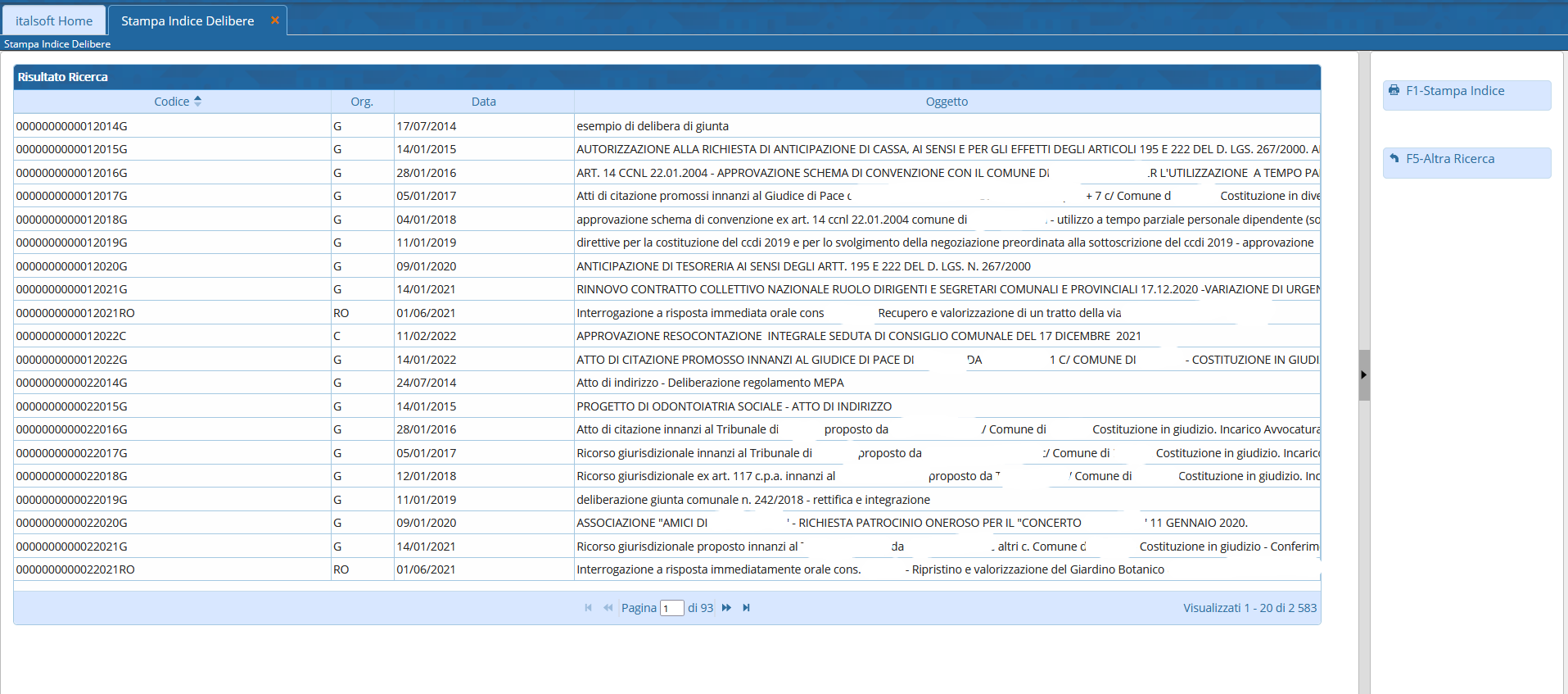 Si accede a Stampa Indice Delibere attraverso il menù → Gestione Documentale → Gestioni → Gestione Atti → Stampa Indice Delibere.