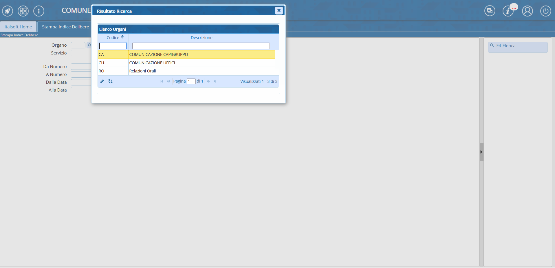 Cliccando sulla lentina in corrispondenza del campo “Organo” il programma proporrà un pannello da cui selezionare l'organo per il quale si intende filtrare la ricerca