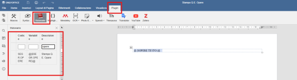 - Nel campo descrizione indicare “Opere” e selezionare la variabile @{$OPERE.TESTO}@