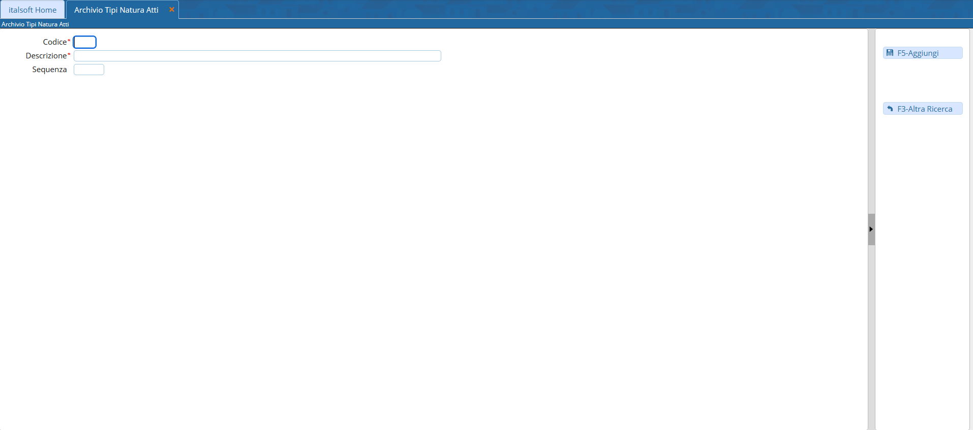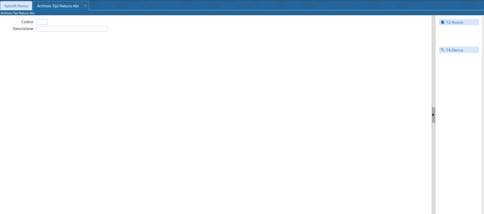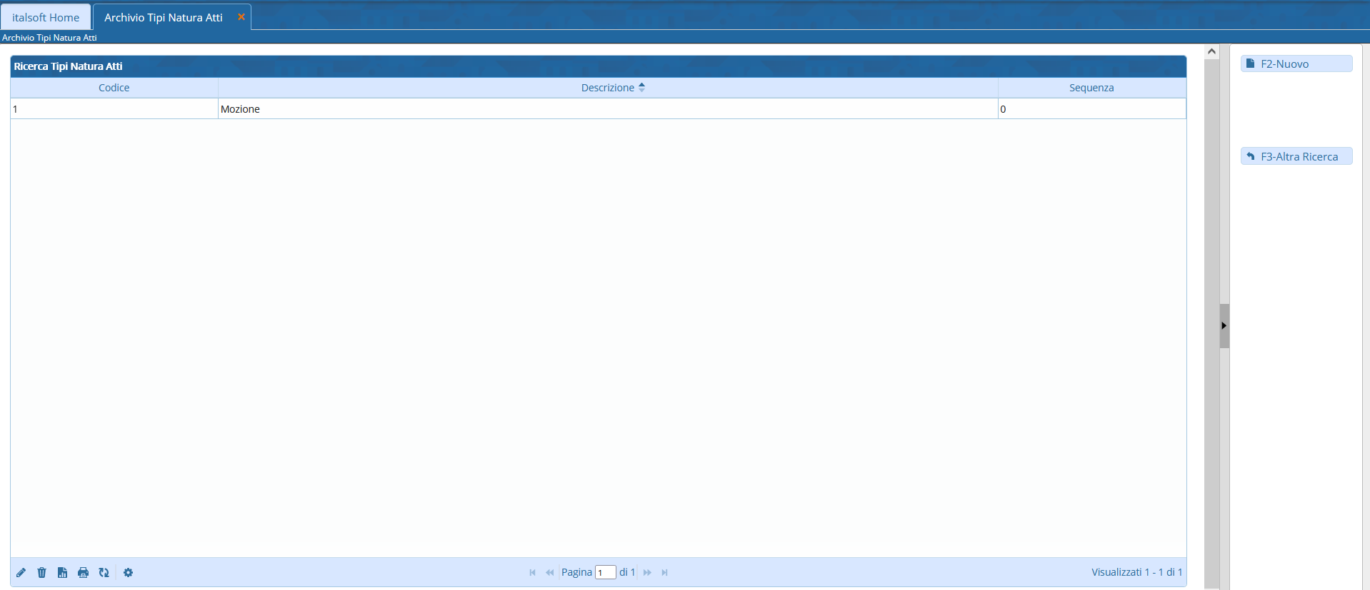 Si accede a Tipi Natura Atti attraverso il menù → Gestione Documentale → Archivi → Tipi Natura Atti.