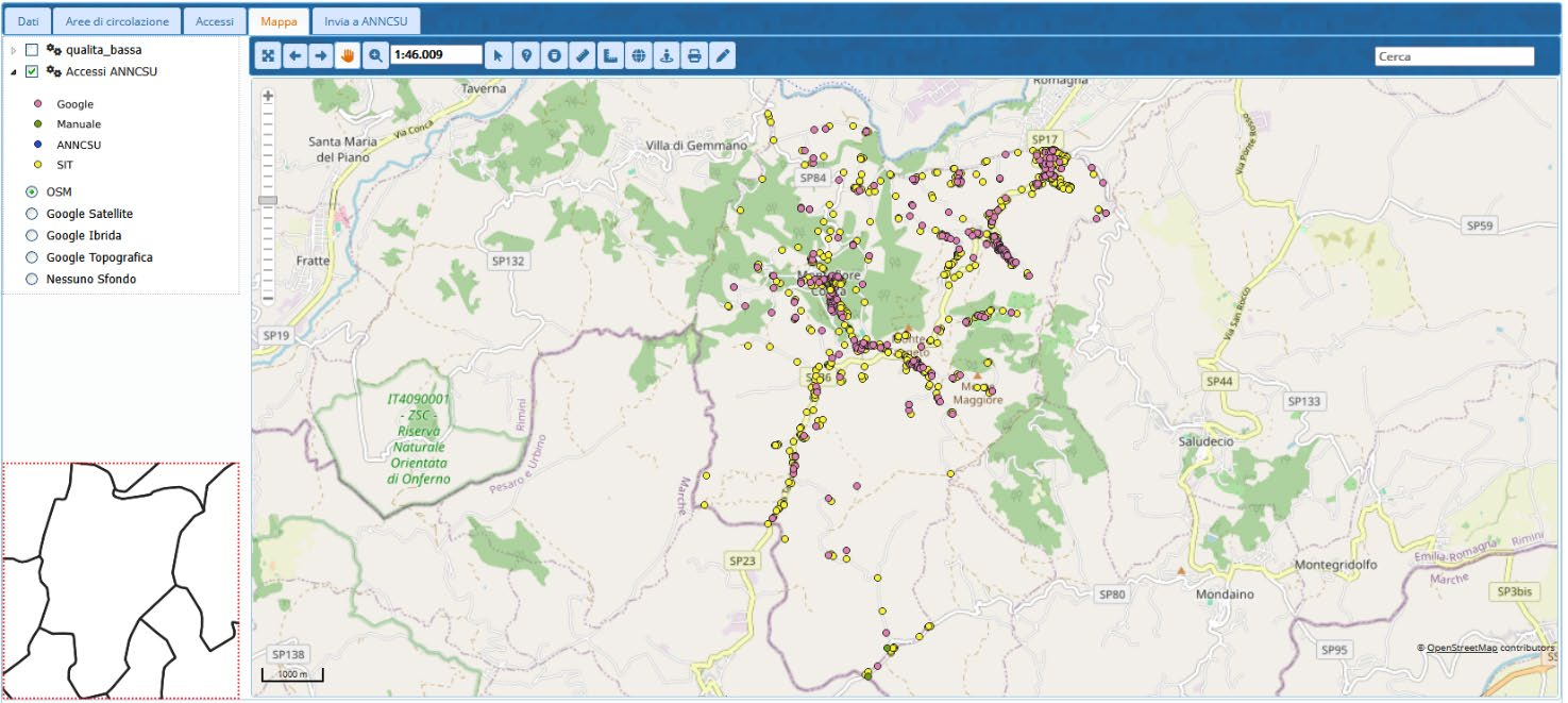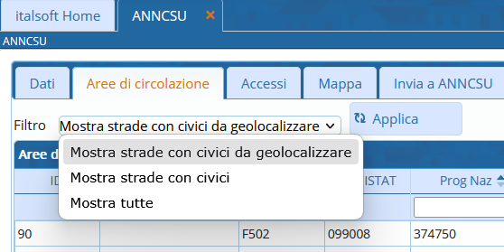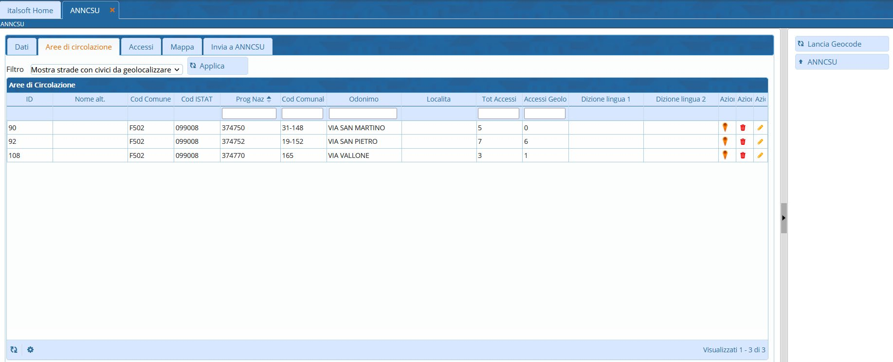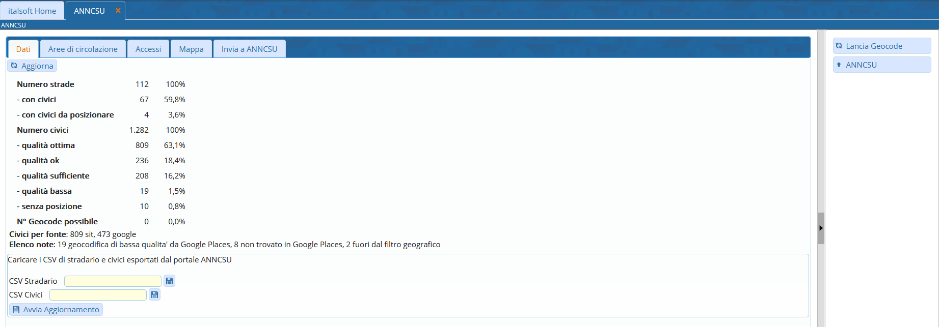I dati (aree di circolazione e accessi) che si vedono nelle rispettive tab, sono quelli che non sono state geolocalizzati in modo automatico; i motivi possono essere sostanzialmente 2: